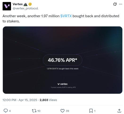 -Vertex’s most recent rewards to VRTX stakers equaled an APR of 46.47%!