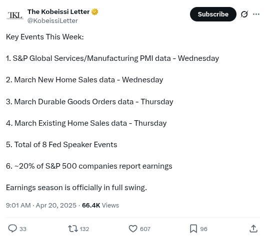 -Relatively quiet week ahead in terms of macro schedule, h/t @KobeissiLetter:
