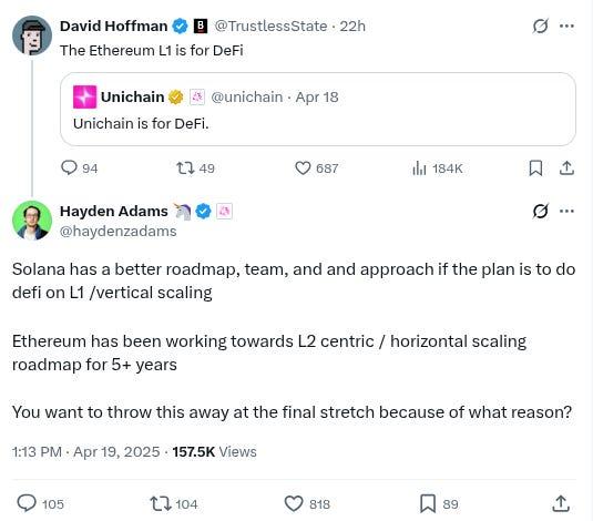 -Ongoing debate about Ethereum’s future and mainnet vs L2’s and everything else, h/t @TrustlessState and @haydenzadams: