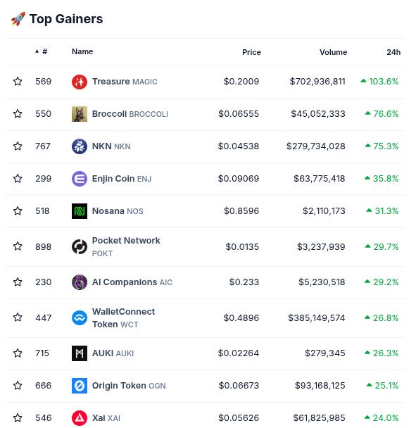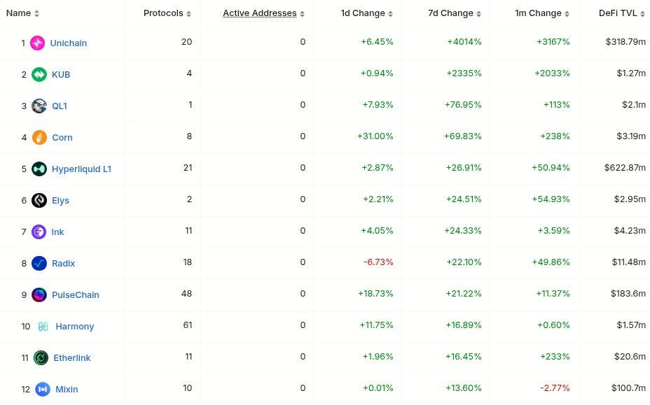 Chains are mixed today. Top 25 chains up at least 10% on the monthly include Sonic (#12), Hyperliquid L1 (#14), BSquared (#19), Unichain (#20), and Hemi (#24).