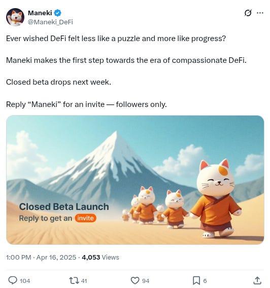 -New project called @Maneki_DeFi. Twitter bio states “The first compassionate DeFi provider. Discover, execute and optimize yield opportunities with AI. Built by @rivoxyz”. Followed by 6 of our mutuals. h/t @amiralnadi: