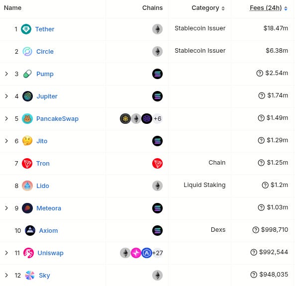 Here’s The Top Entities By 24 Hour Fee Generation (from @DefiLlama):