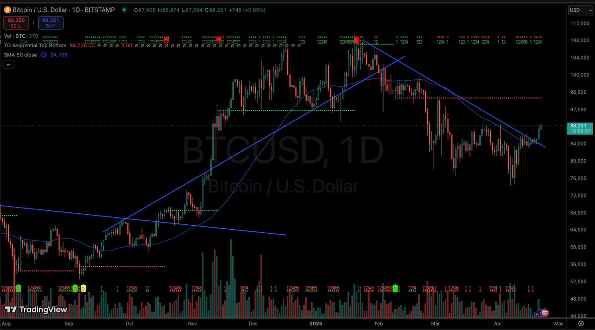 Bitcoin has broken through the mid-term downward trend, and with the change in macro factors (global situation), it is initially confirmed as a "structural turn". It is estimated that BTC will move in the opposite direction with gold and the US dollar in the short term.