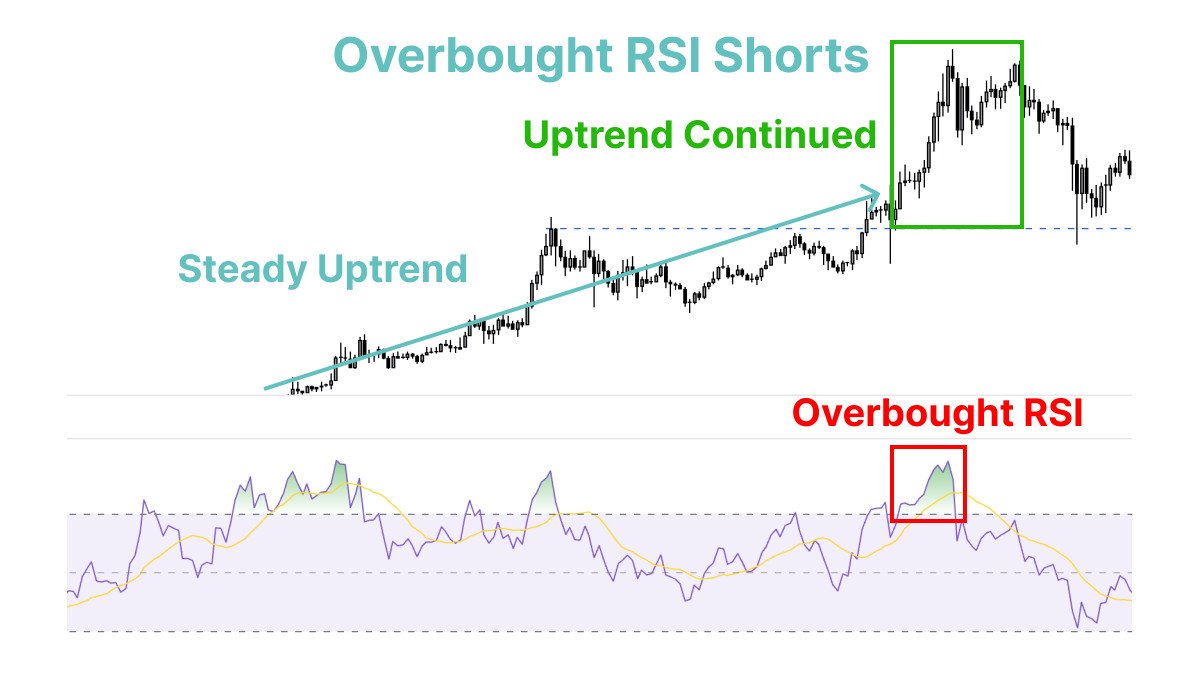 Don’t blindly short an overbought RSI in an uptrend as it often signals strength, not weakness.