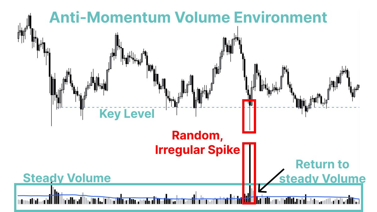 Volume Characteristic: Choppy/ low, steady volume in a sideways market often means random volume spikes are fakeouts and real momentum.