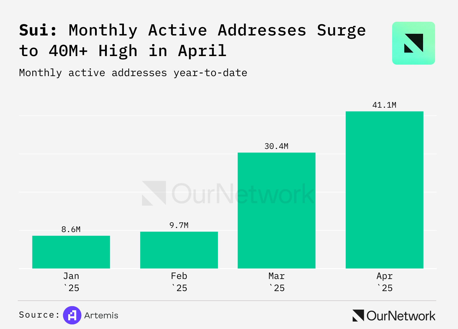 Sui is a first-of-its-kind Layer 1 blockchain and smart contract platform designed to make digital asset ownership fast, private, secure, and accessible to everyone. Sui has seen a tremendous rise in monthly active addresses since mid-February. Where this metric had averaged around 10M, it experienced a measured and consistent increase to over 40M as of mid-April 2025, suggesting new projects built on Sui continue to attract sustained user bases.