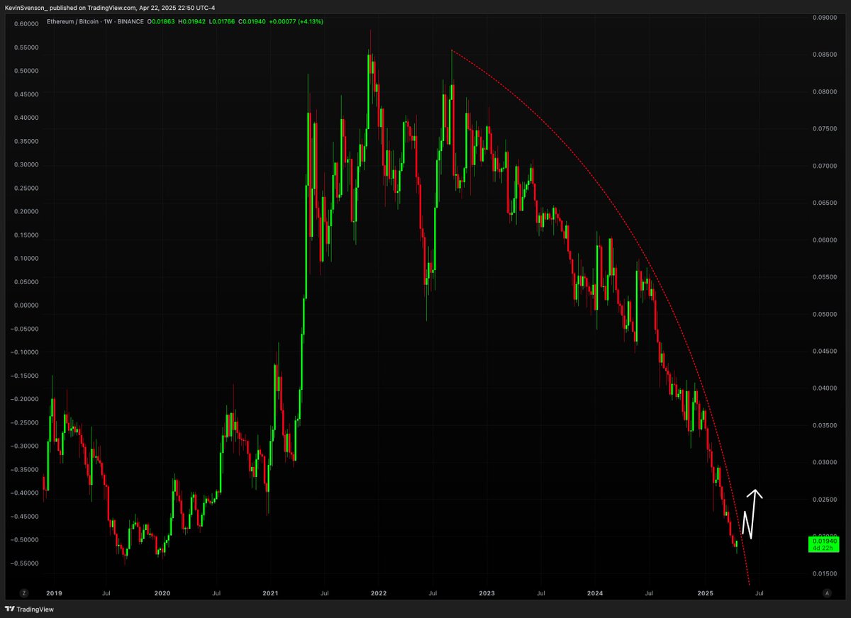 $ETH/ $BTC pair has likely bottomed. I'll take the risk — I'm calling it here. Parabolic trends are inherently unsustainable. The $ETH/#BTC pair is in an inverse parabola and is about to exit upward. #Ethereum🔹