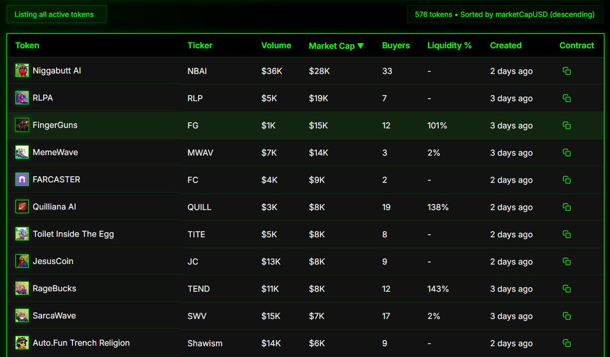 Additionally, according to community members' data analysis of auto.fun (analysis website: https://autofun-iota.vercel.app/), the platform has issued 576 projects, with the current highest token market cap being only $28,000, and most other projects having a market cap of less than $10,000, indicating a cold reception.