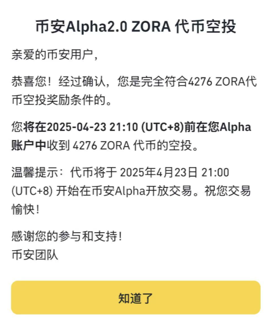 $ZORA will also be traded on @binance Alpha at 21:00 (UTC+8) on April 23, 2025, and eligible users will receive an airdrop of 4,276 $ZORA 🎁 worth over $100