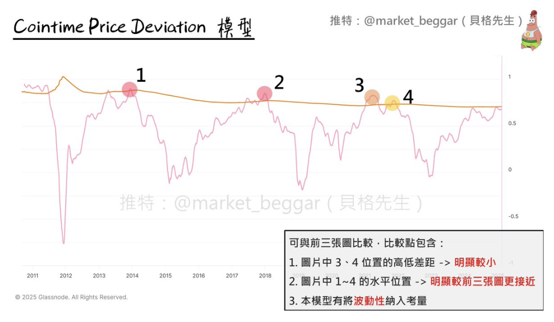 The Cointime Price Deviation model is one of the models I personally designed to observe tops,and the detailed content can be referenced in the previous post(On-Chain Data School (VII): A Brand New BTC Magical Pricing Methodology Involving ARK Research (II) ).