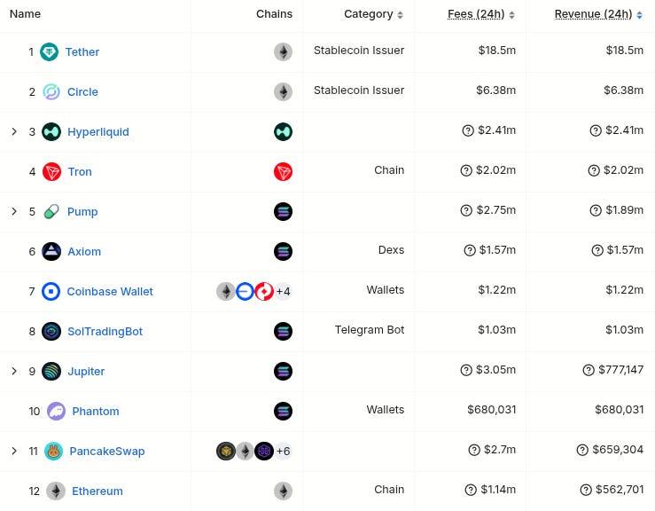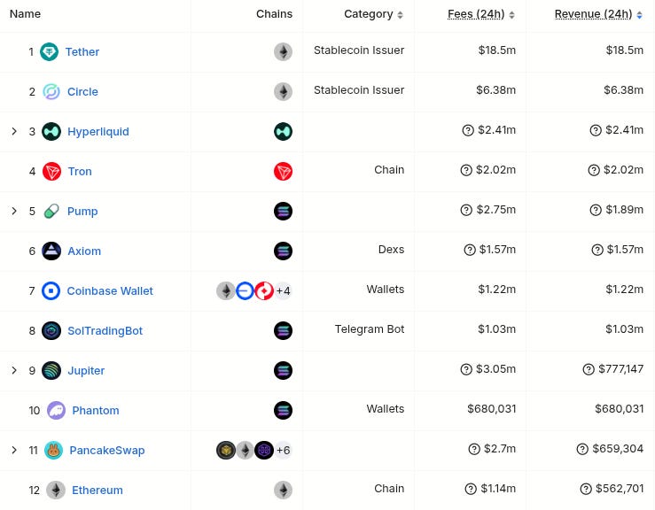 Here’s The Top Entities By 24 Hour Revenue Generation (from @DefiLlama):