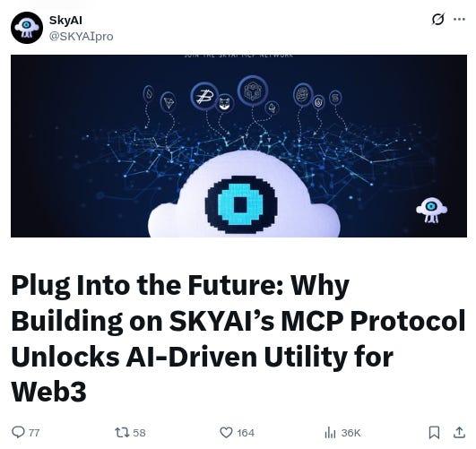 -New project called @SKYAIpro. Twitter bio states “SkyAI is an all-in-one AI ecosystem powered by MCP, designed to seamlessly integrate intelligent solutions across industries.” Followed by 2 of our mutuals. h/t @sandraaleow: