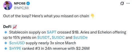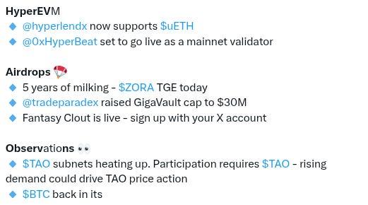 -$crvUSD supply has tripled in the last month, $ZORA-TGE is today, and $TAO/Bittensor and HyperEVM continue to generate much excitement, h/t good news recap from @NPC_68: