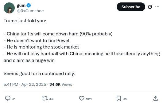 -Trump made some comments last night that were 180 degrees different than what he has been saying the last couple weeks, and they unsurprisingly spiked markets upward, h/t @0xGumshoe: