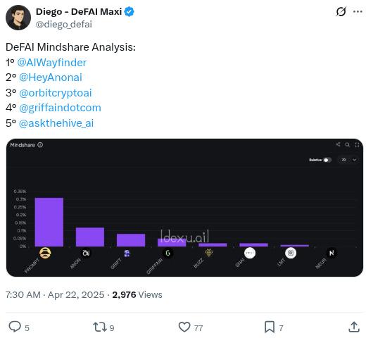 -Top DeFAI projects by mindshare right now are @AIWayfinder, @HeyAnonai, @orbitcryptoai, @griffaindotcom, and @askthehive_ai, h/t @diego_defai::