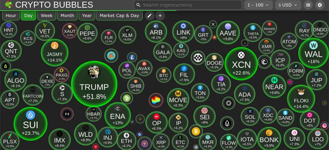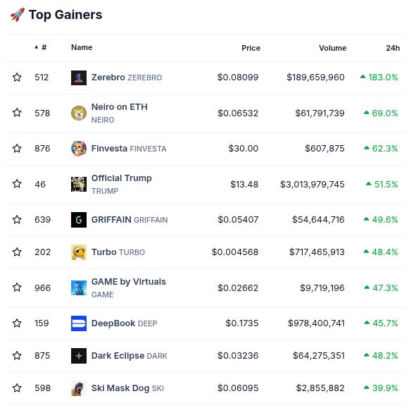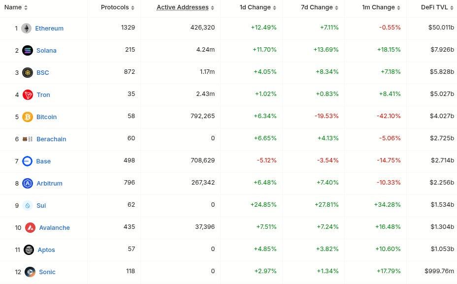 Chains are very green today. Top 25 chains up at least 20% on the weekly include Sui (#9), Hyperliquid L1 (#14), Unichain (#20), and Bitlayer (#21).