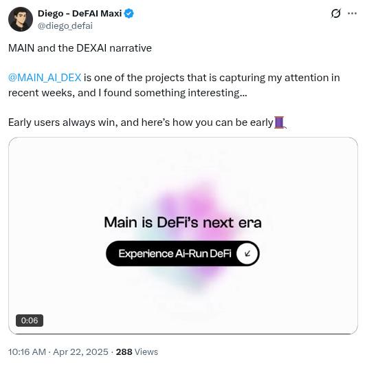 -Something new called @MAIN_AI_DEX. Twitter bio states “The first AI-governed DEX. Built by @CryptoAlgebra. Welcome to the DEXAI era.” Followed by 14 of our mutuals. h/t @diego_defai: