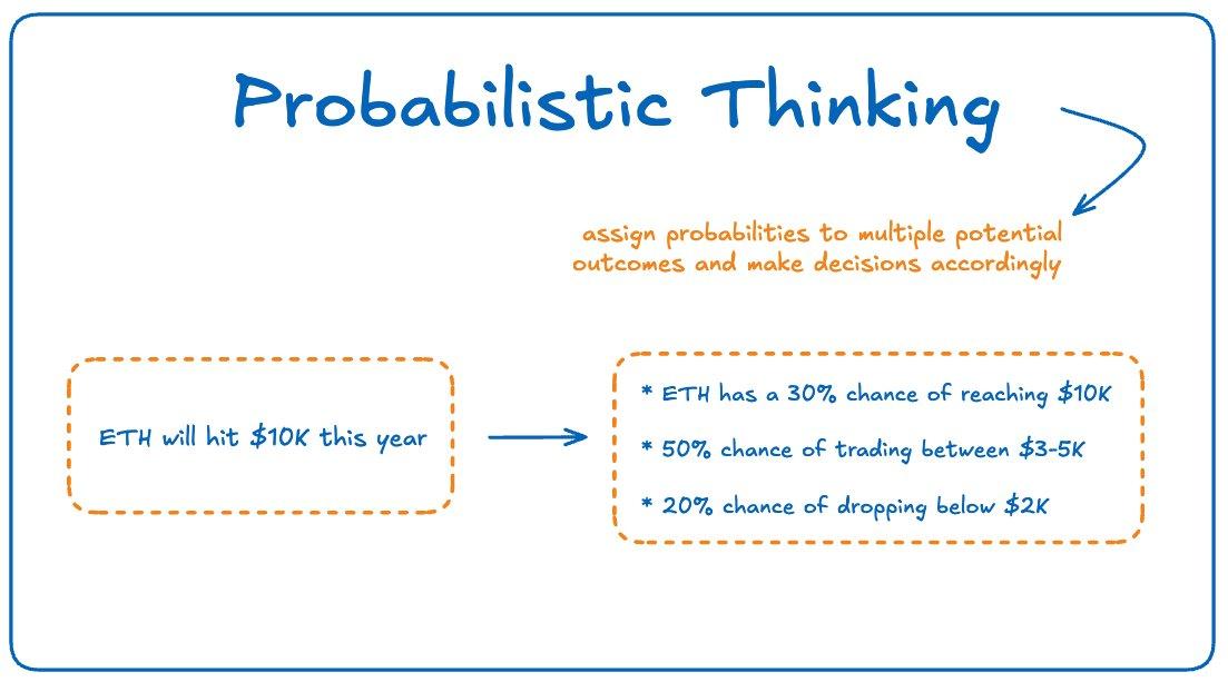 Most crypto investors fall into binary thinking: "This project will definitely rise 10x" or "The market will certainly crash". This absolutist mindset leads to overconfidence, incorrect position sizing, and emotional collapse when predictions fail. Efficient crypto investors are different; they assign probabilities to multiple possible outcomes and make decisions accordingly. Instead of saying "ETH will definitely rise to $10,000 this year", they would say "ETH has a 30% probability of rising to $10,000, a 50% probability of fluctuating between $3,000 and $5,000, and a 20% probability of falling below $2,000".