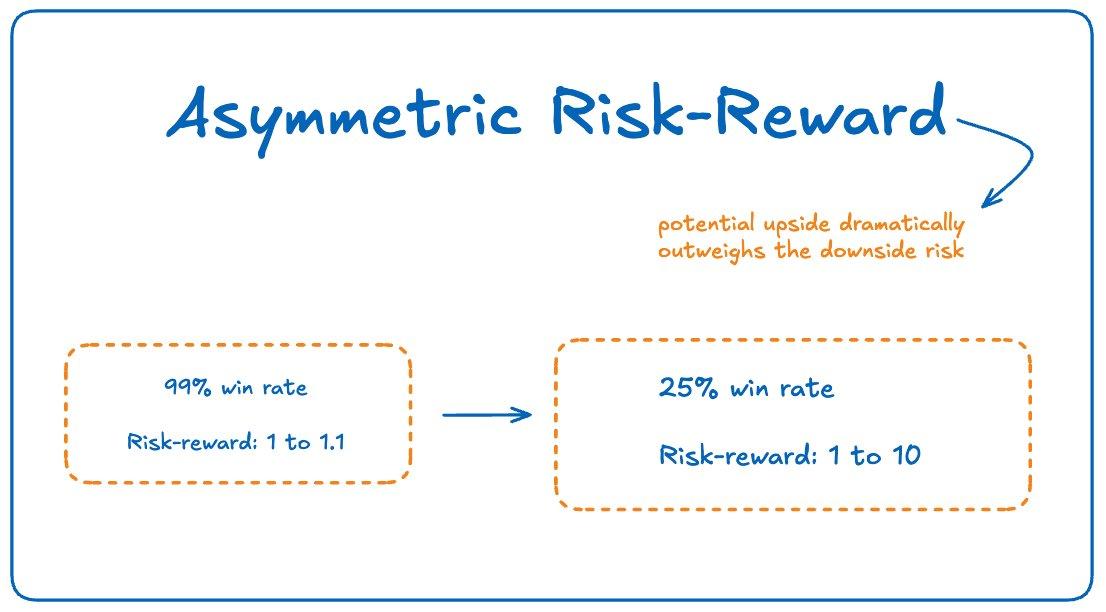 Traditional wisdom tells you to seek "good investments", but efficient crypto investors seek asymmetric investment opportunities where potential returns significantly exceed downside risks. Asymmetric risk-reward means the investment portfolio should be able to withstand numerous small losses while capturing occasional massive gains, including: