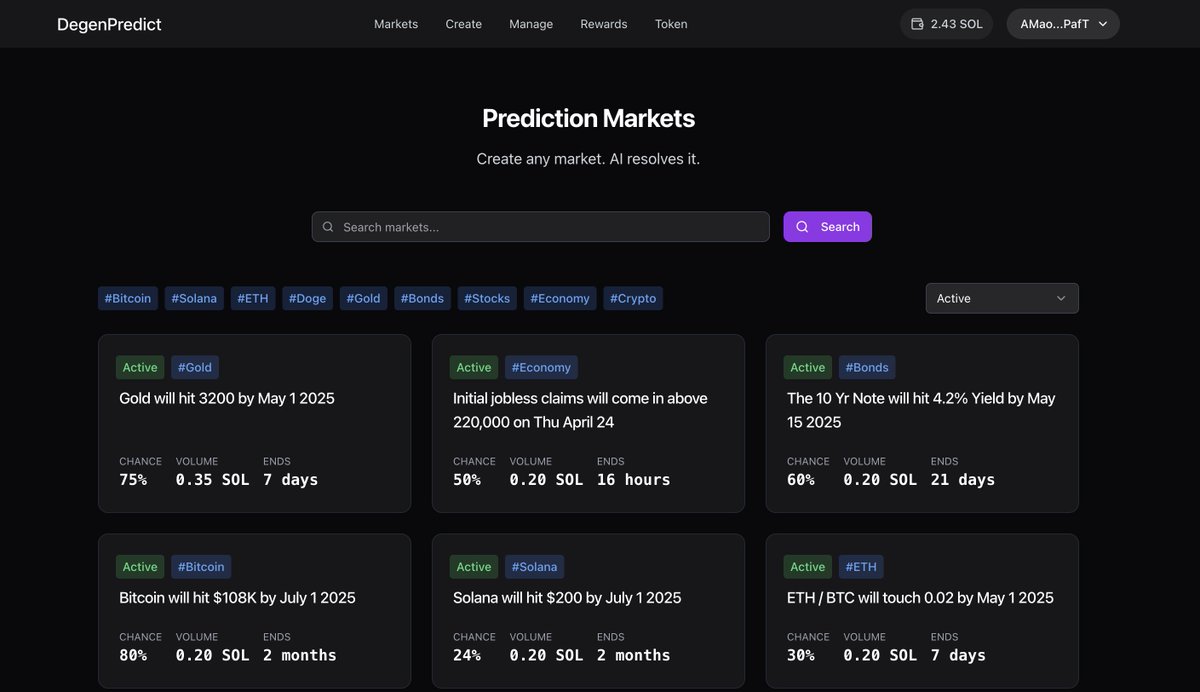 We're going to focus on very short term (<1 month) crypto markets entirely settled by AI for now. We'll add in the hybrid markets later.