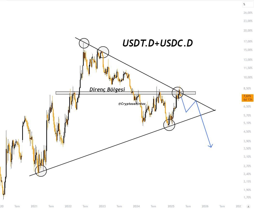 Investor Cryptosahintas revealed that the combined USDT.D + USDC.D index reached a critical resistance level of 8% this month. This is a bullish sign for altcoins. When stablecoin dominance reacts to resistance, it often signals that capital may be preparing to flow into altcoins, potentially triggering a strong price rally.