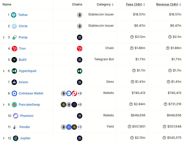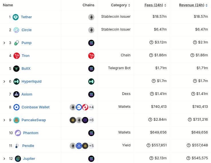Here’s The Top Entities By 24 Hour Revenue Generation (from @DefiLlama):