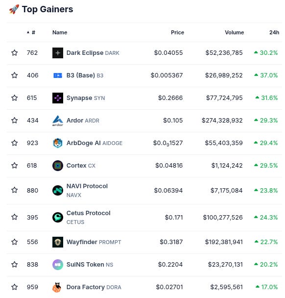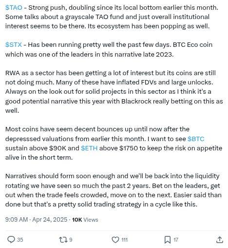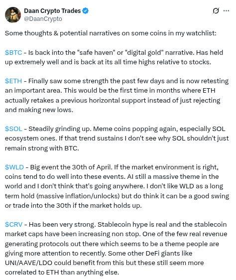 -Prices are up both on stonks and crypto. In the latter both $TAO/Bittensor and $CRV/Curve are catalyzing discussion due to recent outperformance. h/t thoughts from @DaanCrypto: