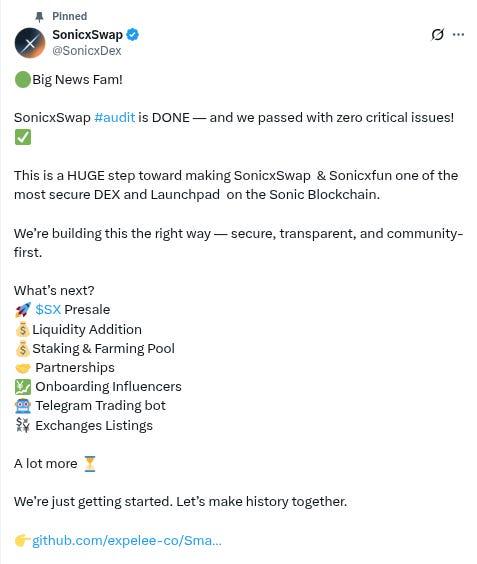-New project called @SonicxDex has been added to @DefiLlama, categorized as a dex on Sonic. Twitter bio states “...leading Dex and Launchpad on Sonic Blockchain powered by deflationary Token $SX. #Sonic.” Followed by 4 of our mutuals.