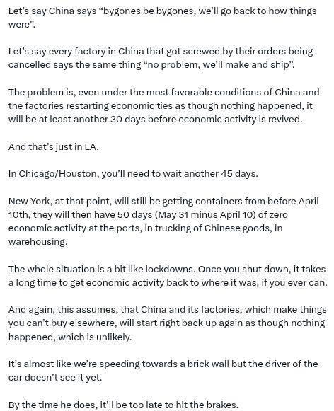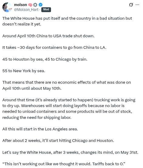 -There is intense debate in macro circles about whether Trump’s tariffs will be inflationary on the one hand (which Jerome Powell has also suggested) or deflationary or at least neutral on the other hand (which is the position that Scott Bessent seems to be endorsing). Alongside this, a number of individuals from the shipping and ecom industries are going viral on Twitter/X with dire warnings about the impact of the China tariffs. One the one hand its important to note that these individuals are sort of “talking their book”, but on the other many of them are Trump supporters themselves, so one can’t really dismiss it as partisan either. Prime example with 5k+ retweets from @Molson_Hart: