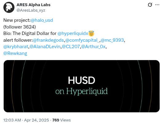 -New project called @halo_usd. Twitter bio states “The Digital Dollar for @hyperliquidx 😇”. Followed by 113 of our mutuals. h/t @AresLabs_xyz: