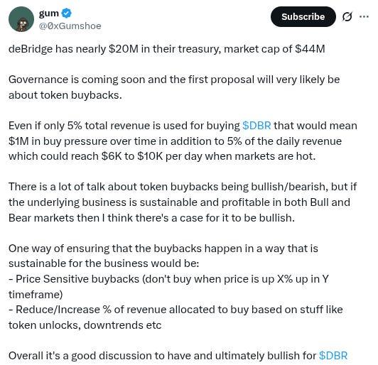 -Does its large treasury vs market cap ratio and potential token buybacks make $DBR/deBridge a good potential investment? h/t interesting tweet from @0xGumshoe: