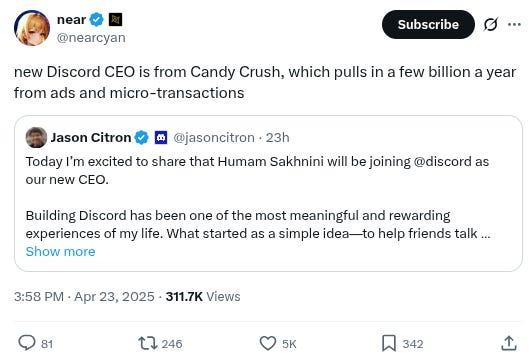 -Interesting observation from @nearcyan, that the new CEO of Discord is from Candy Crush, and how this may impact Discord’s future: