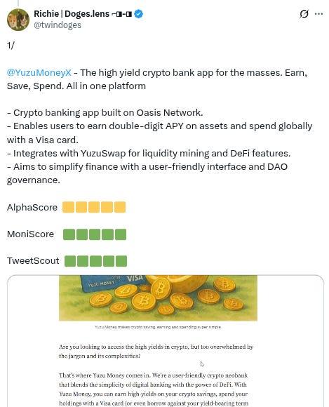 -New project called @YuzuMoneyX. Twitter bio states “The high yield crypto bank app for the masses. Earn, Save, Spend. All in one platform.” Followed by 4 of our mutuals. h/t @twindoges: