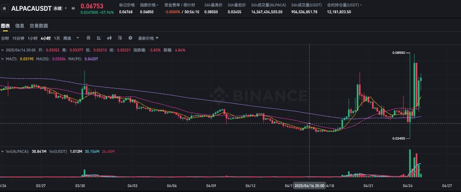 Binance delists, market makers pump 62% in a single day, shorts go crazy, short with the futures extreme funding rate reaching -24% in a single day! A dramatic long and short battle is unfolding for the meme coin ALPACA! Yesterday, Binance announced the delisting of 4 tokens: #ALPACA, #PDA, #VIB, and #WING on May 2nd. ALPACA immediately staged an "extreme volatility drama", repeatedly surging 90%, and dropping 40%, and going back and forth wildly.