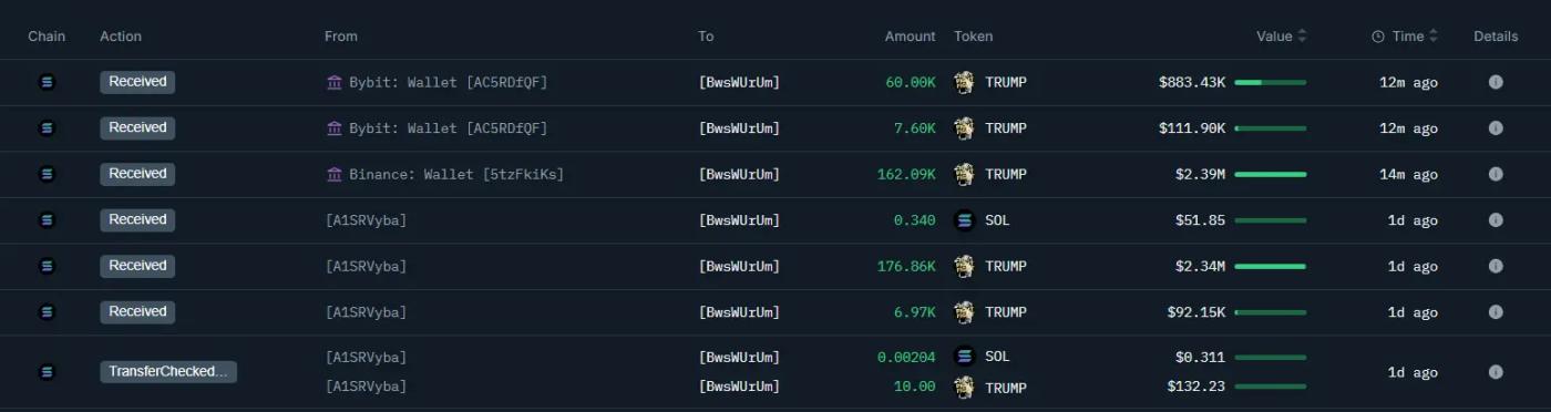 ChainCatcher news, according to on-chain analyst Onchain Lens, a whale withdrew 229,694 TRUMP tokens (worth approximately $3.38 million) from Binance and Bybit. Over the past two days, the whale has withdrawn a total of 413,530 TRUMP tokens, valued at around $5.66 million, with a floating profit of $427,000.