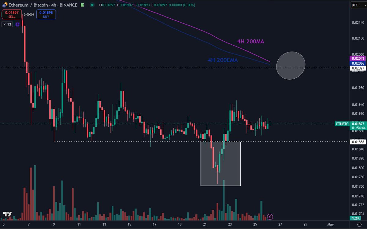 $ETH Good start, shown some strength last week which immediately pulled a ton of alts up with it. As it has retaken its local range, the goal should now be to make it to that range high & 4H 200MA/EMA to attempt a higher timeframe reversal. That should also ignite further twitter.com/DaanCrypto/status/...