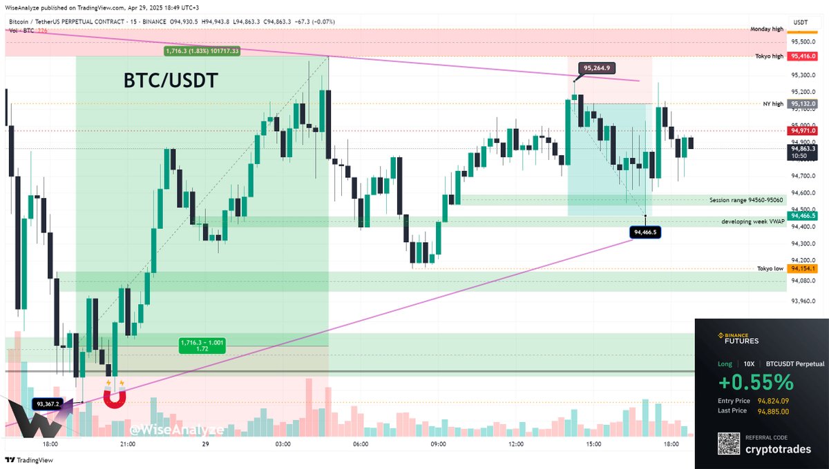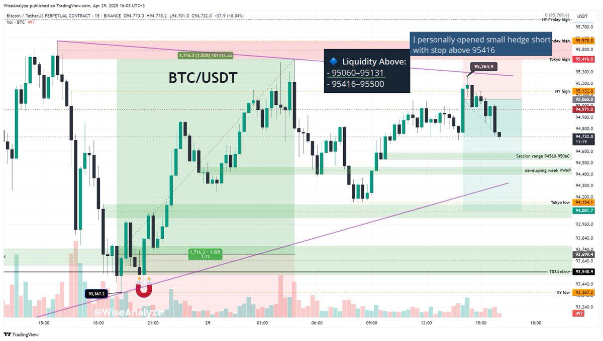 The Asia session pushed price back above Friday’s close, creating a FVG around 93944–94550, which is now the nearest zone for quick bullish dips.