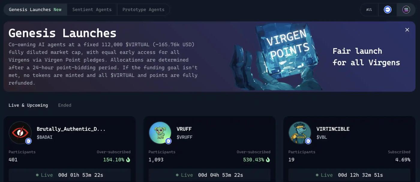 Genesis Launches is a launch platform recently launched by Virtuals Protocol based on Base and Solana. Its core goal is to allow community users to fairly participate in the incubation of new AI Agent projects at an early stage, prevent robots and snipers from grabbing shares at low prices, and protect the safety of participants' funds. Each new project starts with a fixed diluted market value of 112,000 $VIRTUAL (about $120,000). Users participate by staking Virgin Points. There is a 24-hour auction period for each round. The more points you have, the higher the distribution. Currently, there are three main ways for users to earn points: earn Trenchor points by investing in Sentient and Prototype Agent tokens, earn by holding $VIRTUAL tokens, and earn by staking $VADER tokens. Unused points will expire after 30 days.