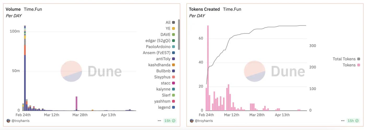 According to Dune data, as of April 28, the Time.fun platform had issued only 396 tokens, but the daily issuance has continued to decline since the peak on the first day of launch, and the issuance has even dropped to single digits or even zero for many days. At the same time, the platform's total transaction volume has exceeded US$200 million, of which Solana contributed more than US$100 million on the first day of launch, and then the transaction volume gradually fell back, currently maintaining in the range of tens of thousands to hundreds of thousands of dollars. The transaction volume is mainly driven by the token $toly, which has long accounted for more than half.