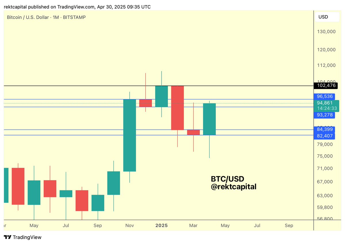 #BTC Bitcoin is on the cusp of a Monthly Close in the $93300-$96500 Monthly Range A Monthly Close like this would solidify Bitcoin's position at these highs, even if downside wicking below $93300 could still occur in May (similar to Dec 2024 or Jan 2025 wicks) $BTC #Crypto