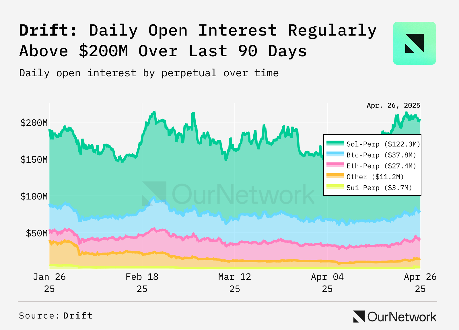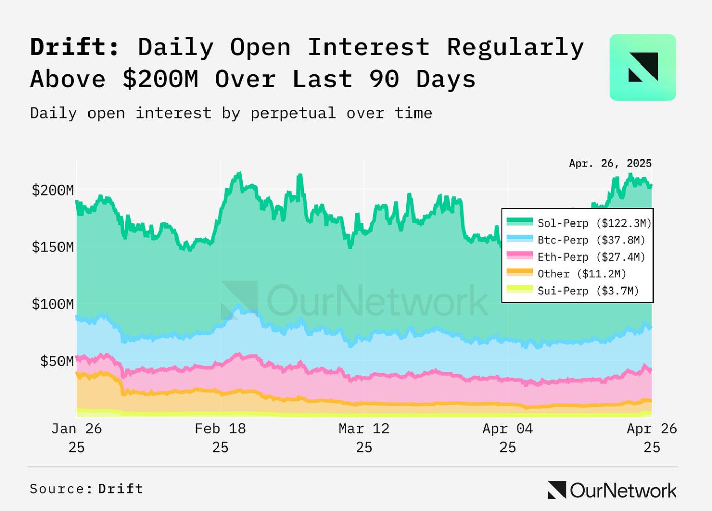Drift is an all-in-one DeFi platform built on Solana. Open interest (OI) on Drift's perpetuals market remained strong over the past 90 days despite a broader market downturn. Drift's OI ranged between $145M and $205M. For much of the 90 days, Drift's OI remained higher than daily trading volume on the platform demonstrating considerable OI-to-volume strength compared with other venues. Drift's SOL-PERP, the Solana token's perpetual futures contract, remained the leader, making up around 60% of OI on Drift's perp market.