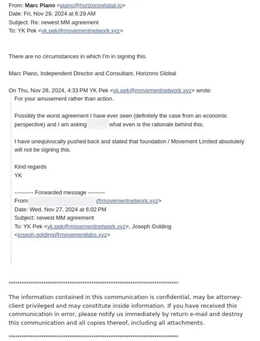 Pek, the foundation's legal counsel, said in an email that the agreement was "probably the worst agreement I've ever seen." In another memo, he warned that the move would hand over control of the MOVE market to an unidentified external entity. Marc Piano, the foundation's director in the British Virgin Islands, also refused to sign the agreement.
