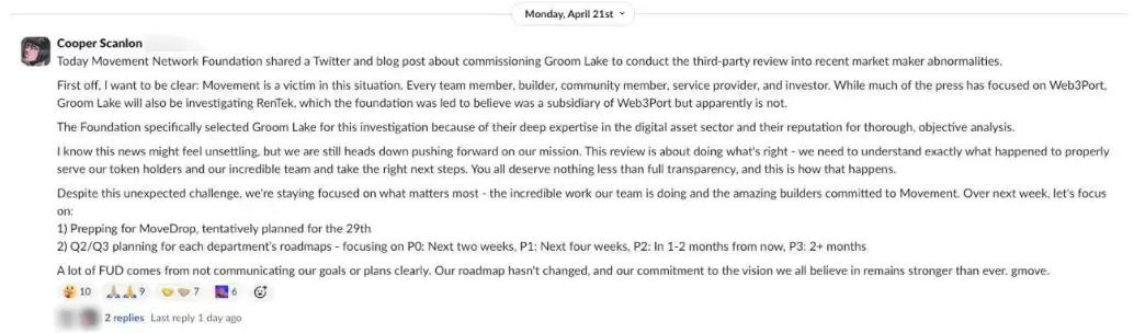 In a Slack message sent to employees, Movement co-founder Scanlon said the company has hired external audit firm Groom Lake to conduct an independent third-party investigation into recent abnormal market-making behavior.