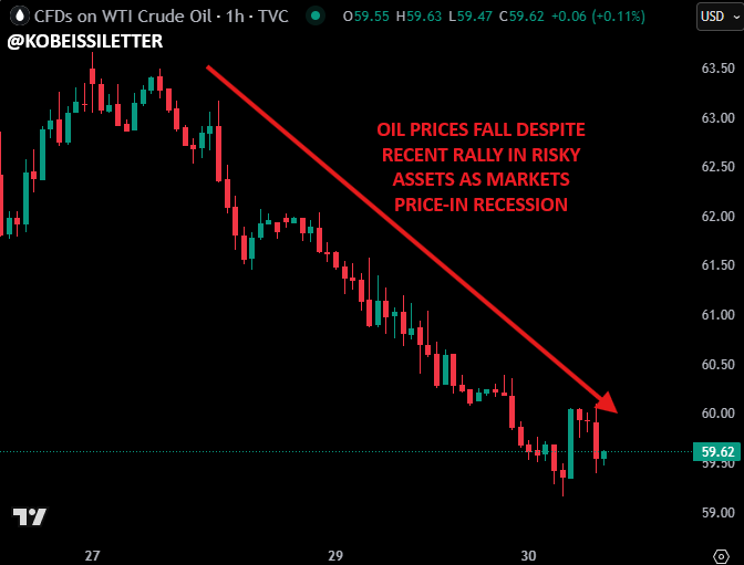 While the S&P 500 and other risky assets rebounded, oil prices have fallen sharply, to below $60.00.