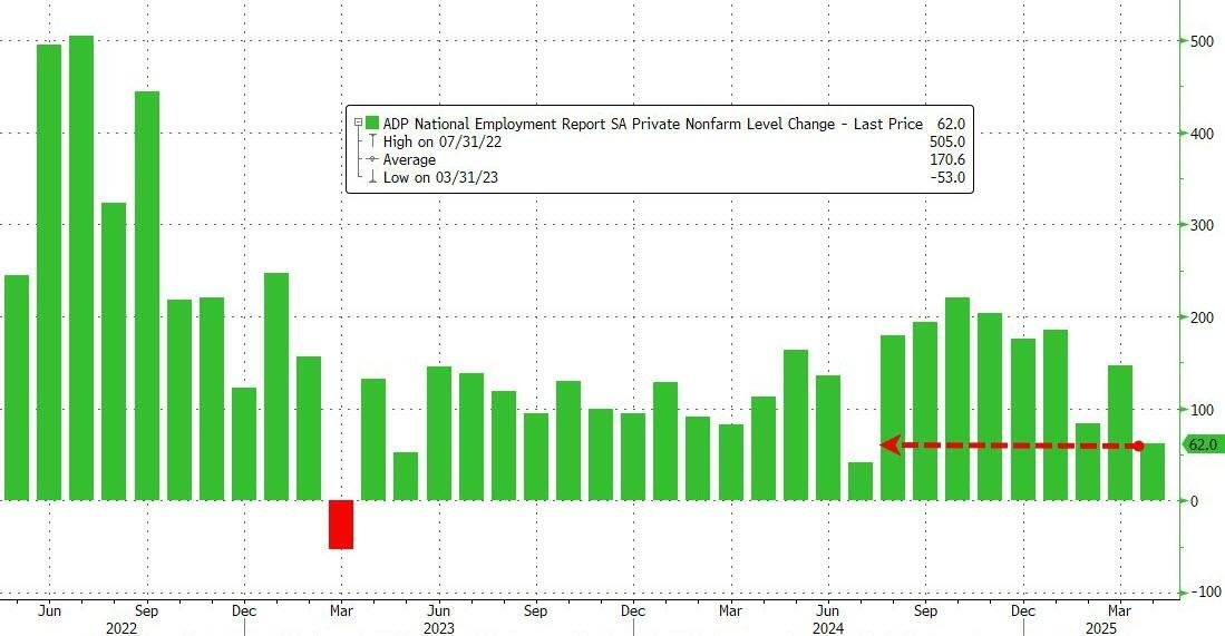 According to ADP, the US economy added just 62,000 jobs in April, the lowest since July 2024, as shown below per ZeroHedge.