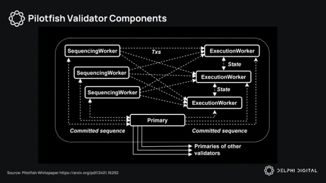 Pilotfish is a horizontally scalable suite of execution engines that breaks the bottleneck of Sui's original single-machine execution model. Traditionally, Sui validators have been monolithic, handling consensus, data retrieval, and state execution on a single machine, limited by vertical scalability in terms of compute, memory, and storage.
