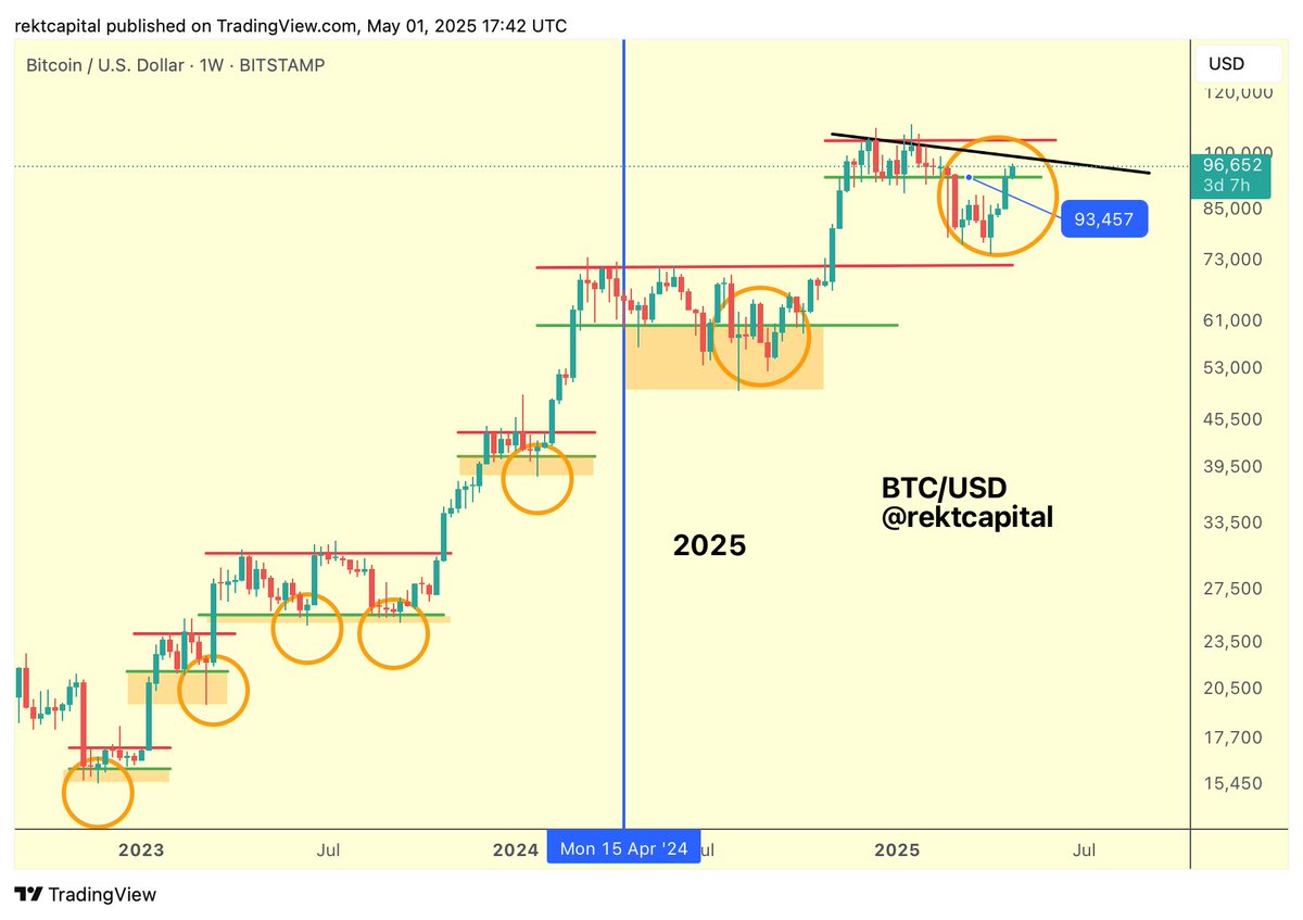 #BTC If Bitcoin continues to hold above $93500 (as it has been thus far), then price will be positioned for a move across the range However, it's key that $BTC breaks the black Lower High resistance within this Range which is positioned at ~$99k this week #Crypto #Bitcoin twitter.com/rektcapital/status...