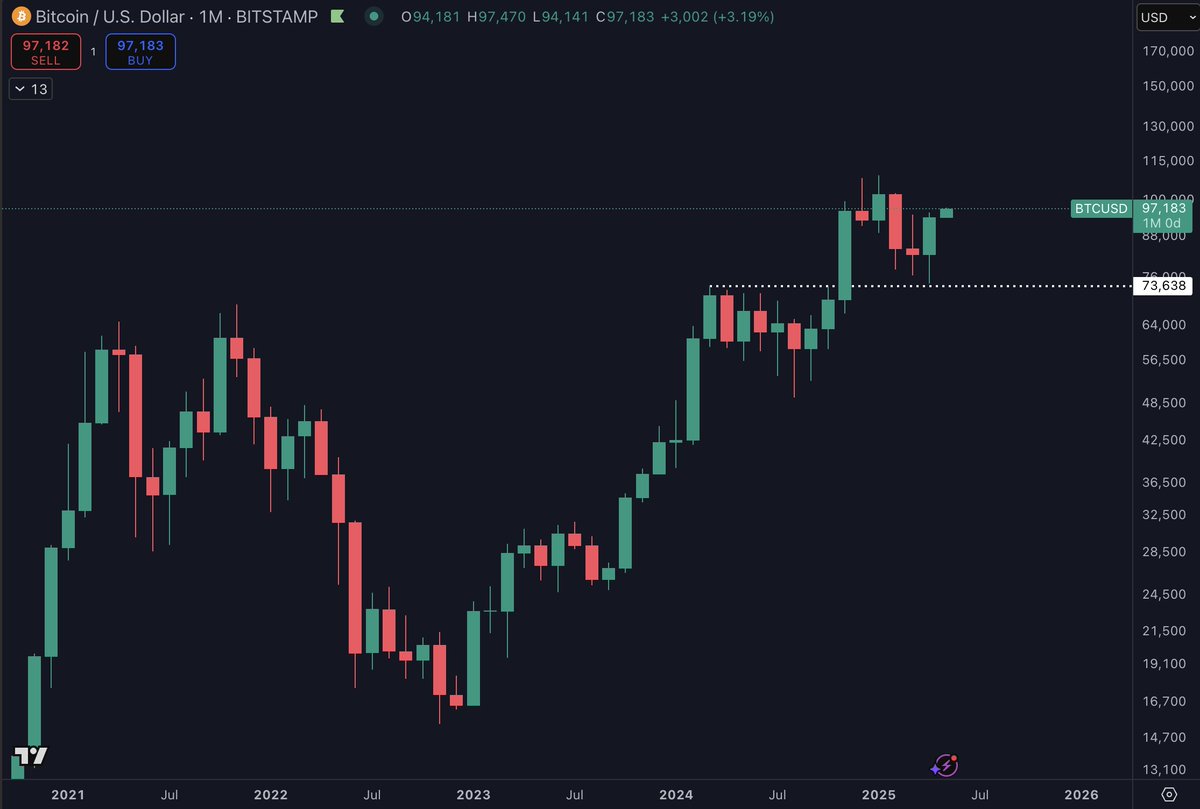 $BTC Closed April with a strong looking monthly candle against all odds. The markets took a big dive at the start of the month, post liberation day but ended up rebounding and $BTC ended up with a +14% month outperforming most assets. Higher low made, it's up to the bulls from