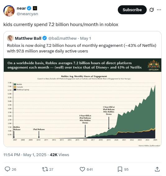 -Fascinating crypto-adjacent stat that Roblox now sees 7.2 billion hours of monthly engagement (43% the size of Netflix), h/t @nearcyan and @ballmatthew:
