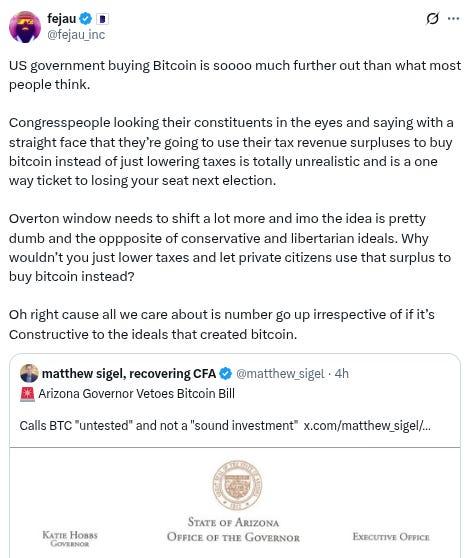 -Much debate today after Arizona Governor vetoes Bitcoin bill, example c/o @fejau_inc: